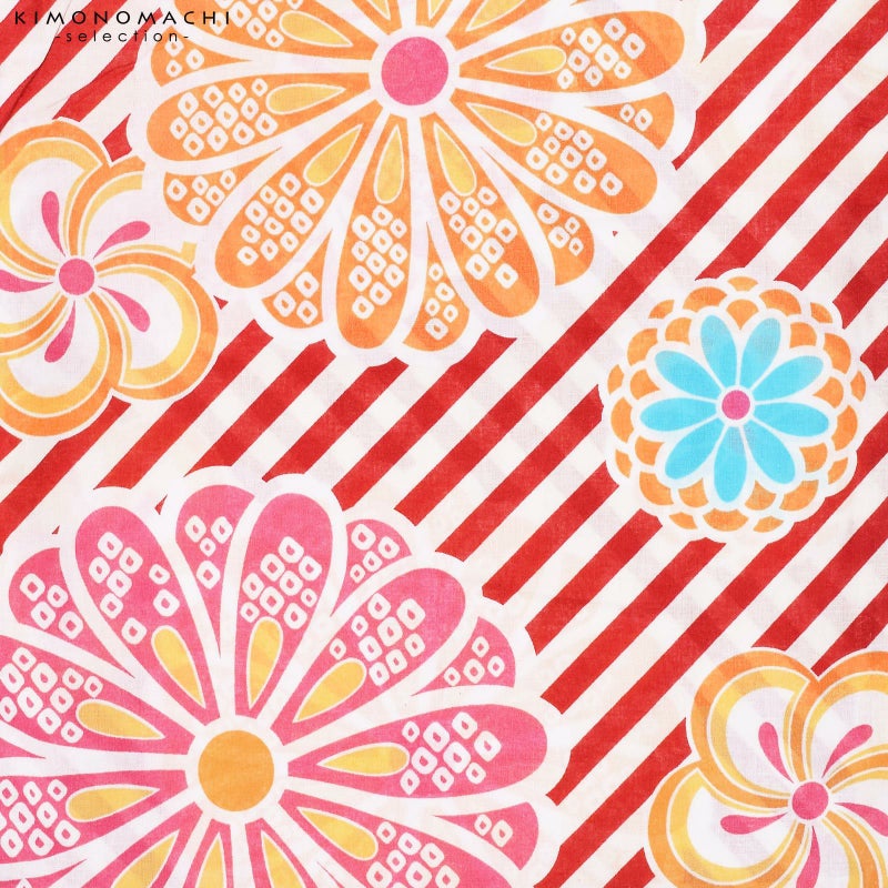 オフホワイトと赤の斜めストライプの地、大輪の菊花やねじ梅を飛ばしたデザイン。明るいオレンジ色、ピンク色、水色の菊花。オレンジ色や黄色、水色のねじ梅。