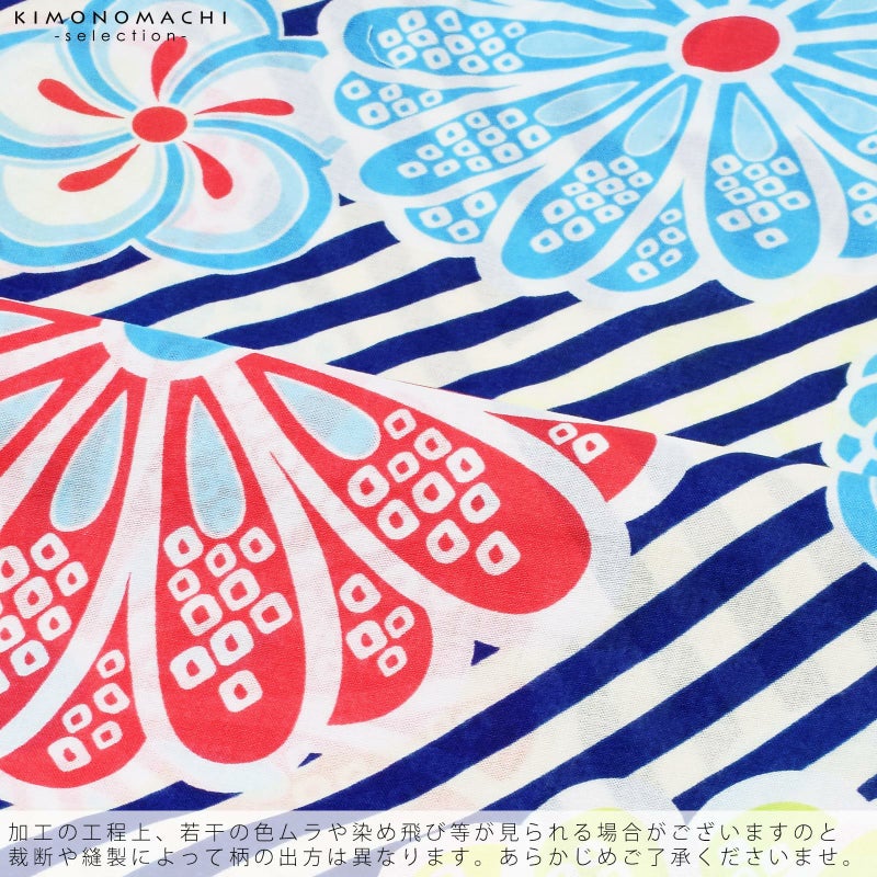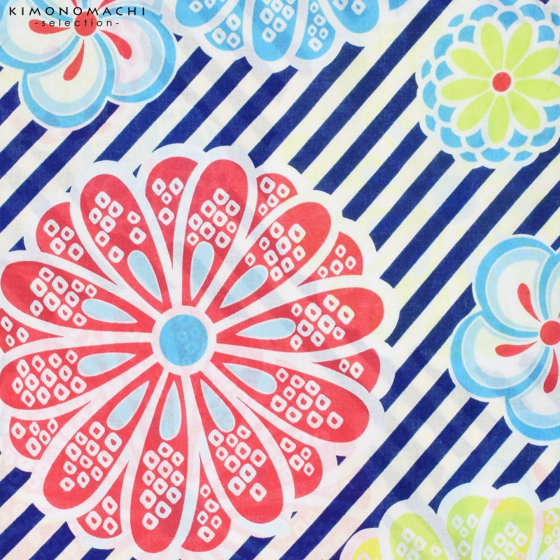 オフホワイトと青の斜めストライプの地、大輪の菊花やねじ梅を飛ばしたデザイン。水色、明るい黄緑、浅い赤の菊花。水色や黄緑、赤のねじ梅。