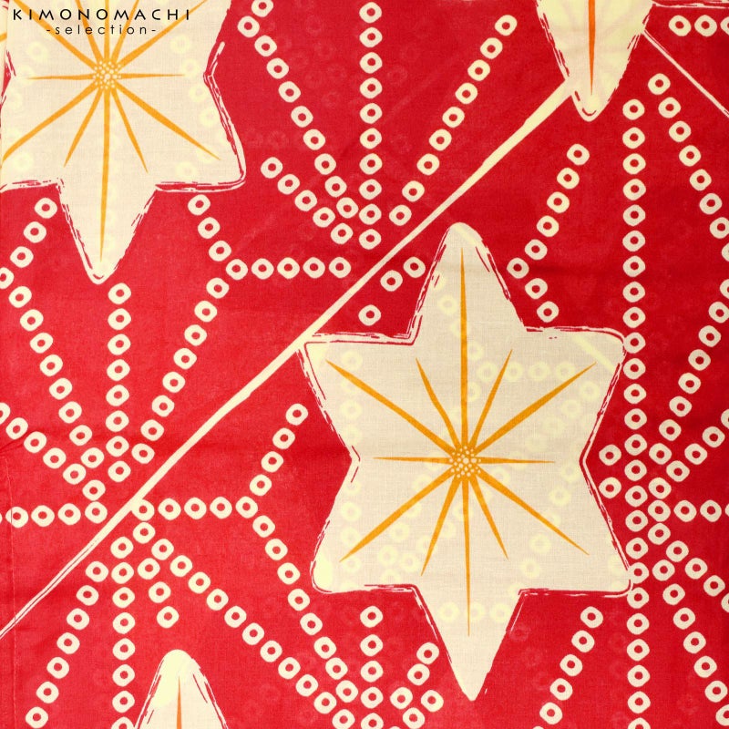 【カラー】深い赤地に、淡い生成り色の鹿の子で表現された麻の葉模様。生成り色の星型の中に、橙色や薄橙色のライン。