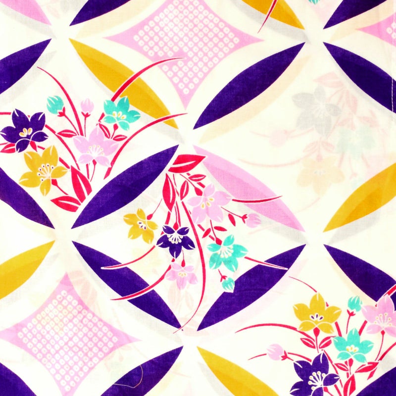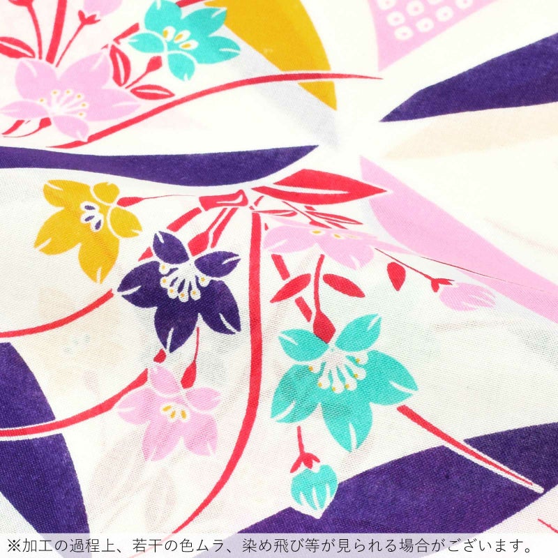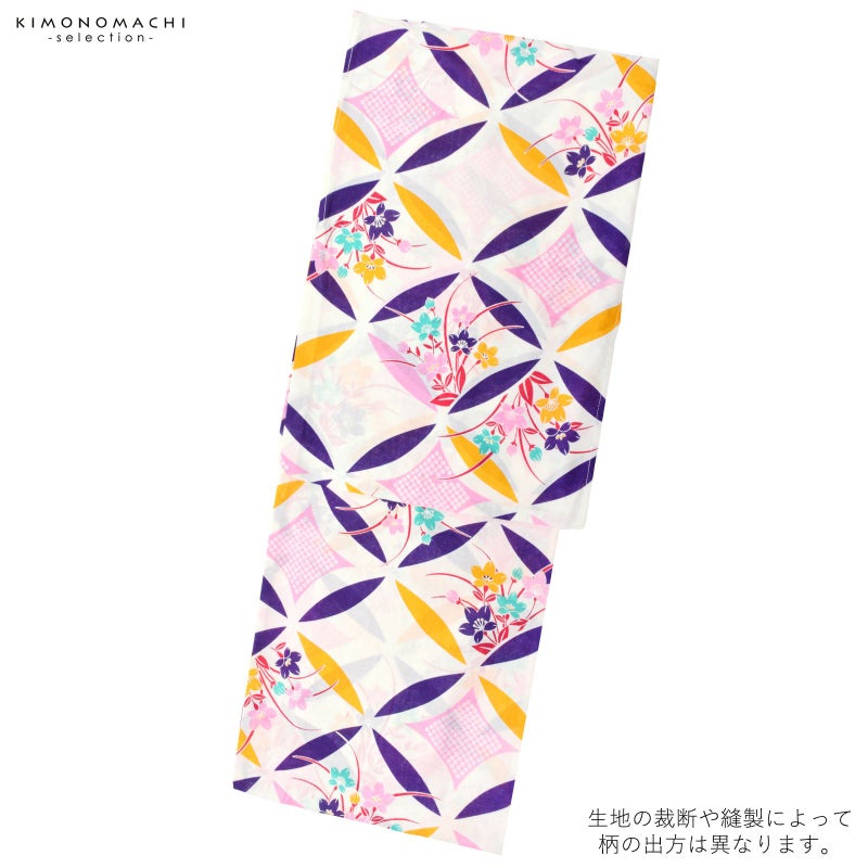 【カラー】白地に、深い紫紺、黄色、ピンクの変わり七宝の柄。七宝の中に桔梗の花。紫紺、黄色、ピンク、ミントグリーンに赤の葉。