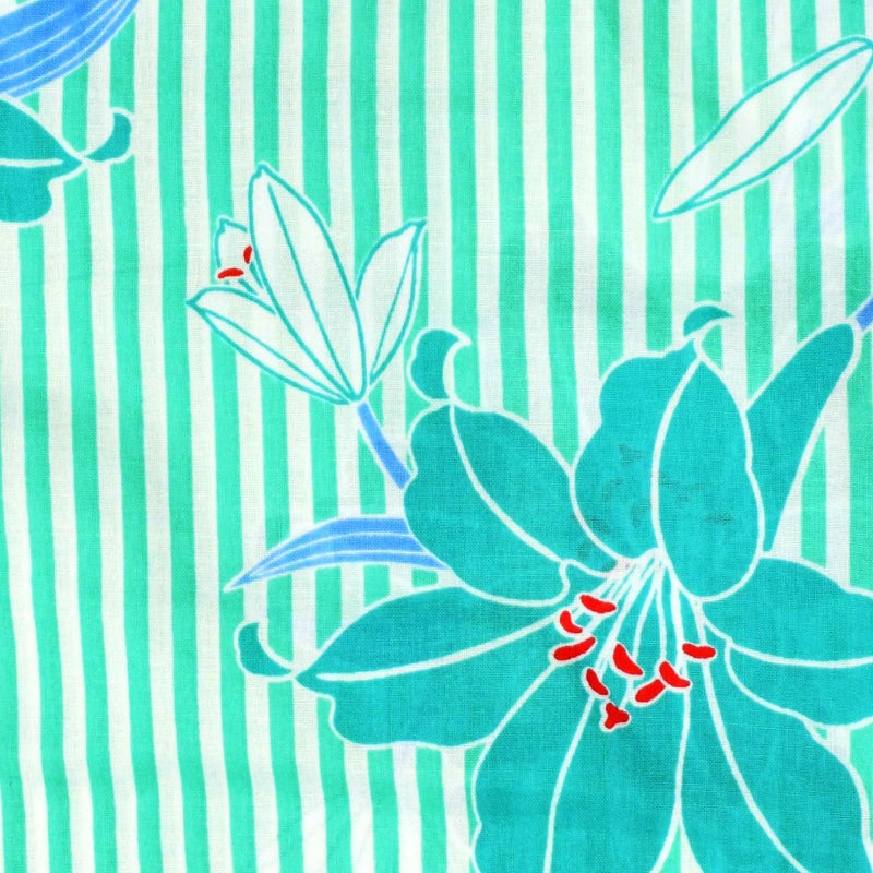 【カラー】白と明るいミントグリーンのストライプの地。白と明るい青緑色の百合の花、浅い青色の葉。