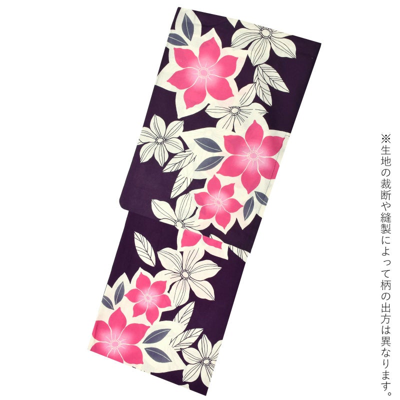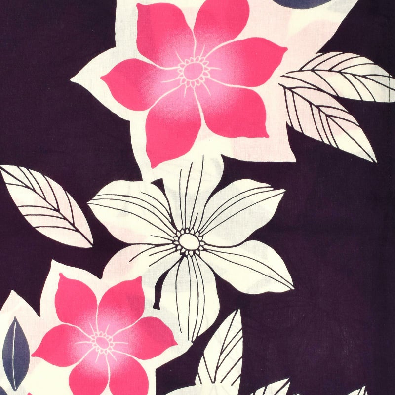 【カラー】赤紫みの紫紺の地に、鉄線の花模様。生成り色に、ピンク色みの赤紫の花。可愛らしさとレトロな雰囲気のある浴衣です。