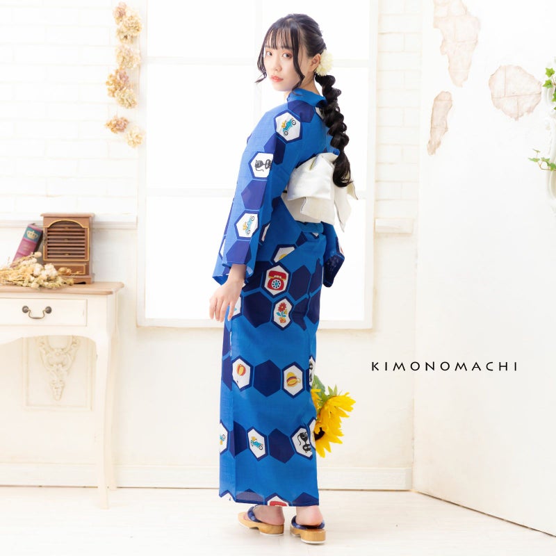 【Prices down】女性浴衣「ネイビー×薄群青 レトロイラスト」フリーサイズ 夏祭り、盆踊りに レトロ ポリエステル 女性浴衣 【メール便不可】m1906ykl50ss2512ykl10