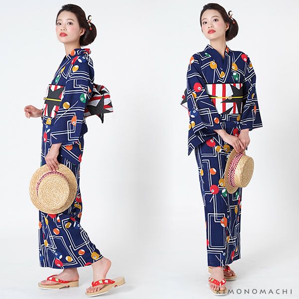 京都きもの町オリジナル浴衣単品「紺青色 ビリヤード」S、フリー、TL、LL ポリエステル浴衣 お仕立て上がり浴衣 レディース 女性浴衣