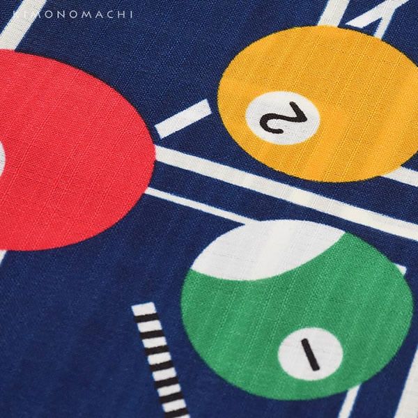 【カラー】濃い紺青色地に、ビリヤード台を思わせる、白色のスクエア模様。鮮やかで濃い赤・黄・緑・オレンジ色などカラフルなビリヤードの玉と、モノトーンのキュー。どこかレトロな印象を漂わせるオシャレ柄!