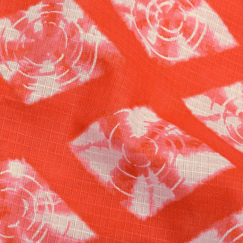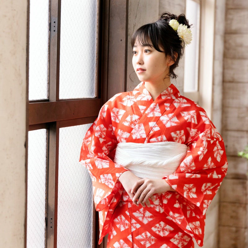 【カラー】赤色の、菱形模様の絞り染め風柄。帯は、落ち着きのある濃い紺藍色や、女性らしいレーシーな素材の白色が好相性。