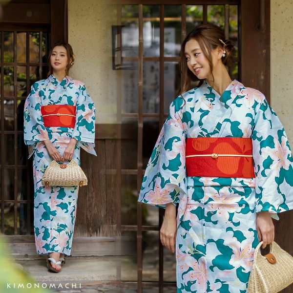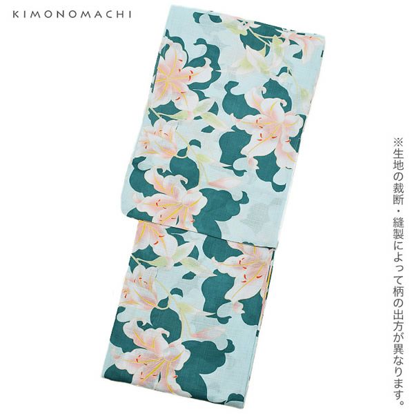 京都きもの町オリジナル浴衣単品「グリーン 百合」S、フリー 綿浴衣 お仕立て上がり浴衣 レディース 女性浴衣