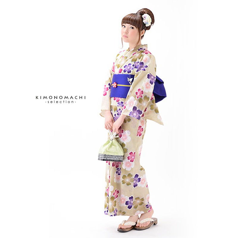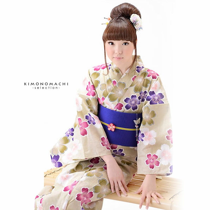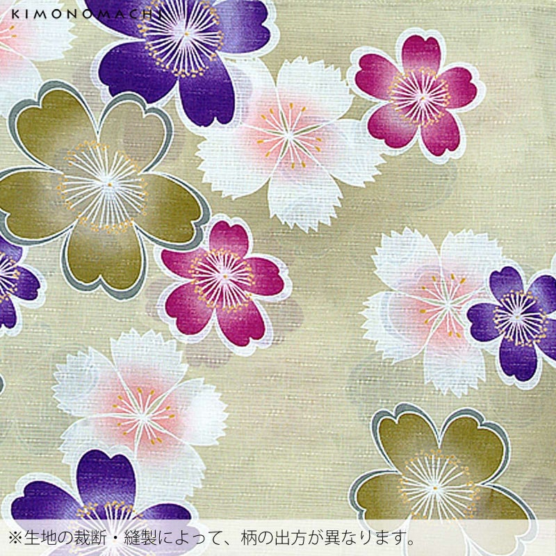 浴衣 レディース 女性浴衣単品「ベージュ 桜と撫子」 綿麻浴衣 プレタ浴衣 お仕立て上がり浴衣Fサイズ
