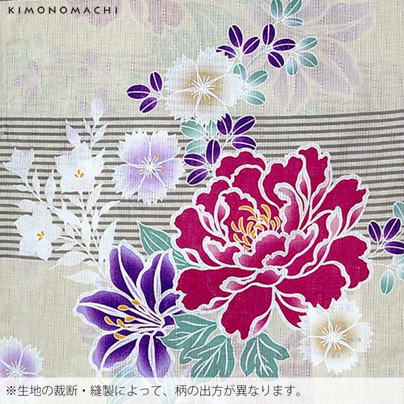【色柄】アイボリー地に細いボーダー、赤紫の芍薬、紫の百合・白の桔梗や撫子などの花