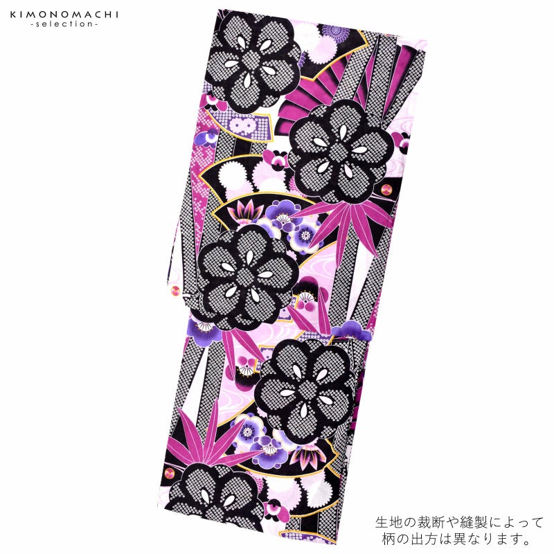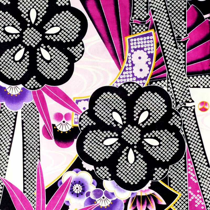 【カラー】黒と白、赤紫を基調に、檜扇や扇面、竹、大きな花紋の柄。青藤色の梅や淡いピンク色みの薄紫の流水など。