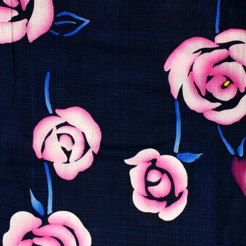 【カラー】深い紺と青の細かな格子の地に抽象的な薔薇の花模様。ピンクと白のぼかし、深い赤紫の花。ブルーの葉。