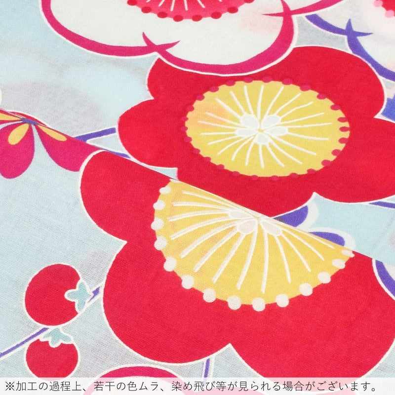 【カラー】淡い水色地に、抽象的な枝に咲く梅の柄。白やピンク、マゼンタ、浅い青紫色、淡い黄色など。
