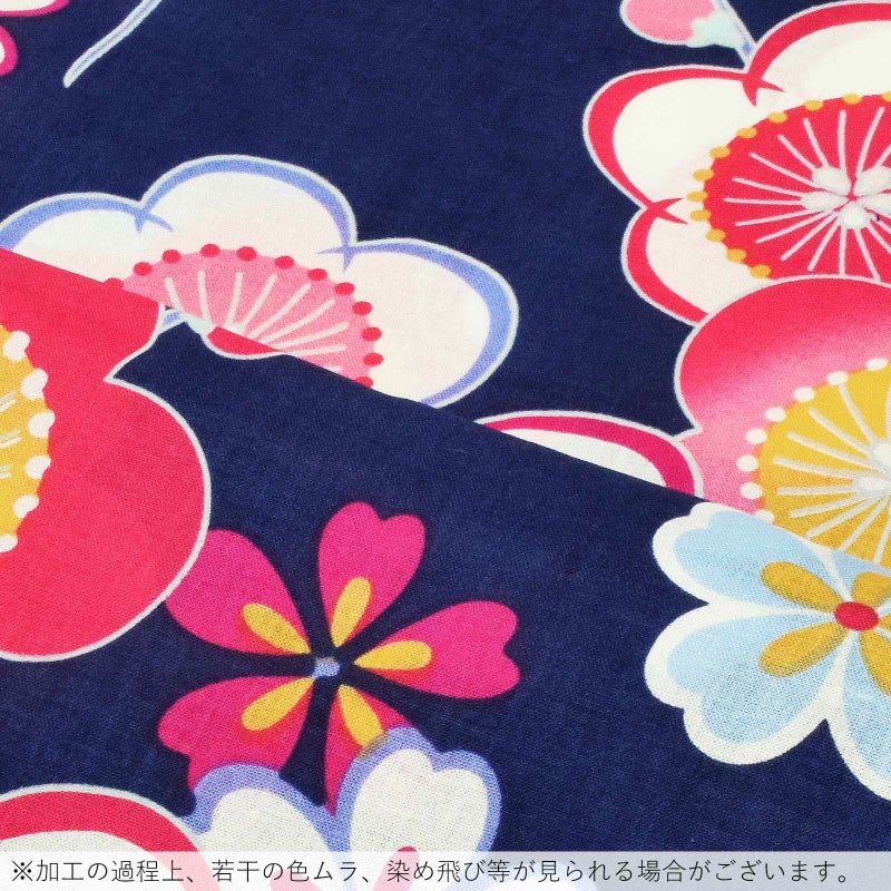 【カラー】紺地に、抽象的な枝に咲く梅の柄。白やマゼンタピンク、淡い水色、浅い山吹色など。