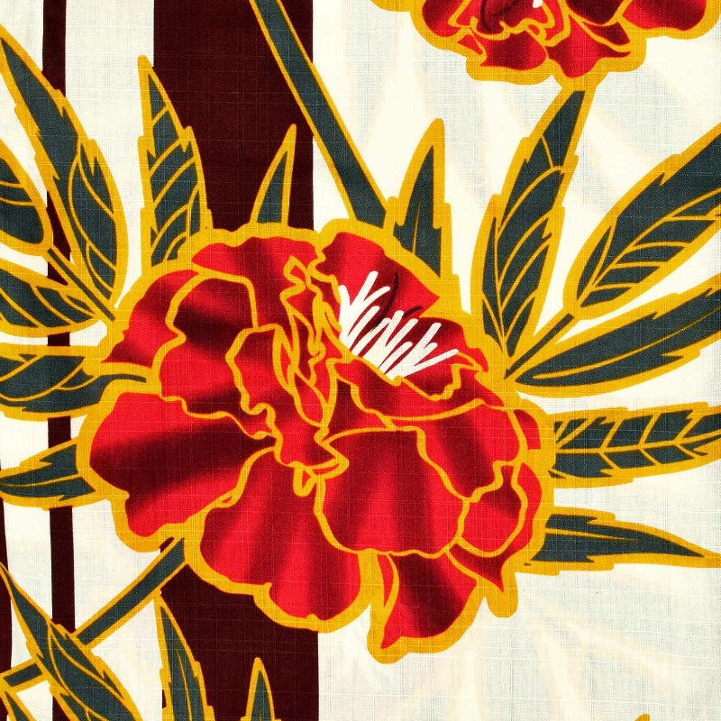 【カラー】オフホワイトの地に深い茶色の太縞。山吹色の太い輪郭線でくっきりと表現された牡丹。赤の濃淡の花、深緑の葉。
