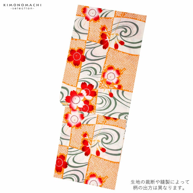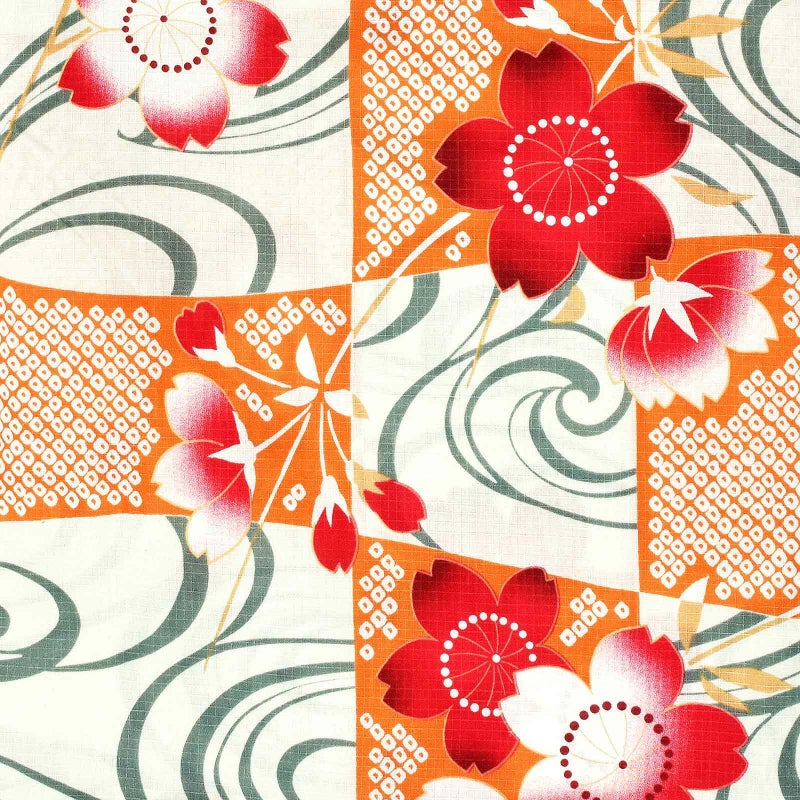 【カラー】オフホワイトの地に深緑色の流水模様と、深い橙色の鹿の子模様を市松模様に並べた柄。赤いグラデーションの桜の花模様。