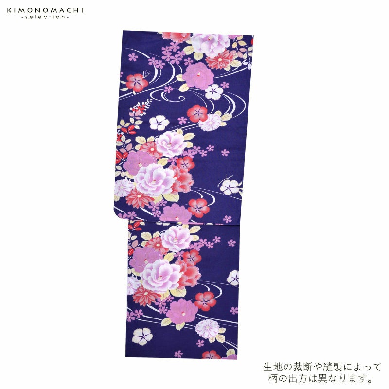 浴衣 レディース 単品 「紺地に花と流水」 フリーサイズ yukata 【メール便不可】