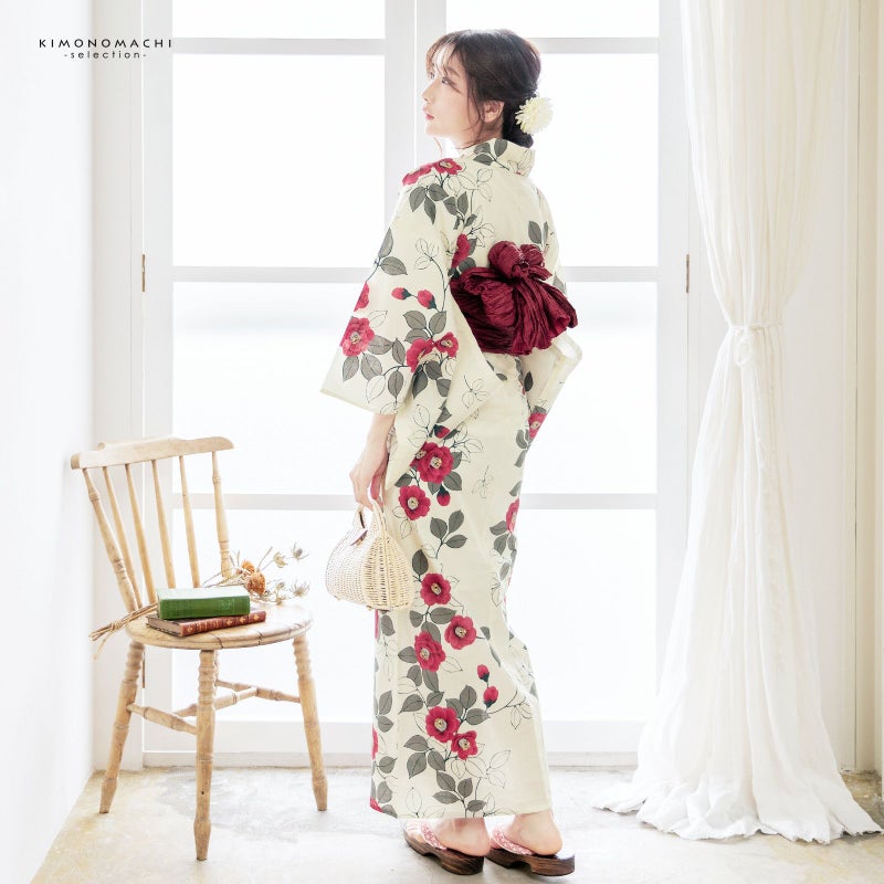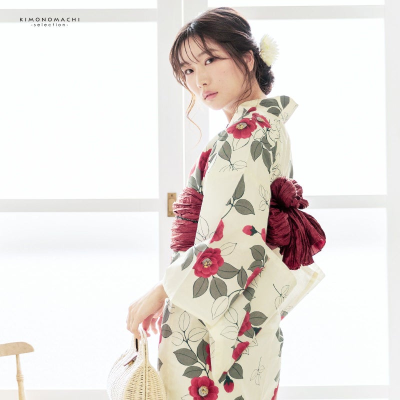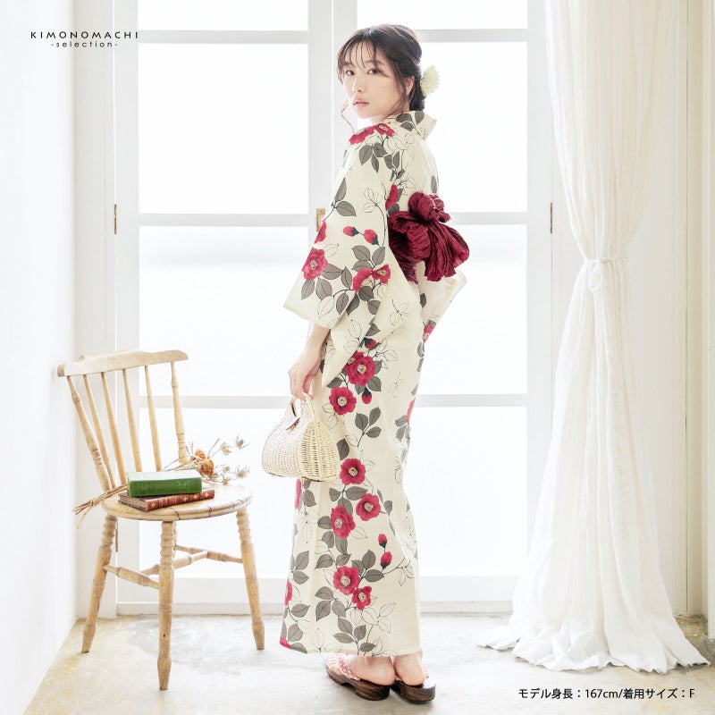 5. 浴衣 レディース 女性浴衣単品 「アイボリー 椿」綿浴衣 プレタ浴衣 お仕立て上がり浴衣 大人浴衣 Fサイズ 女性用 女性浴衣 ゆかた【メール便不可】