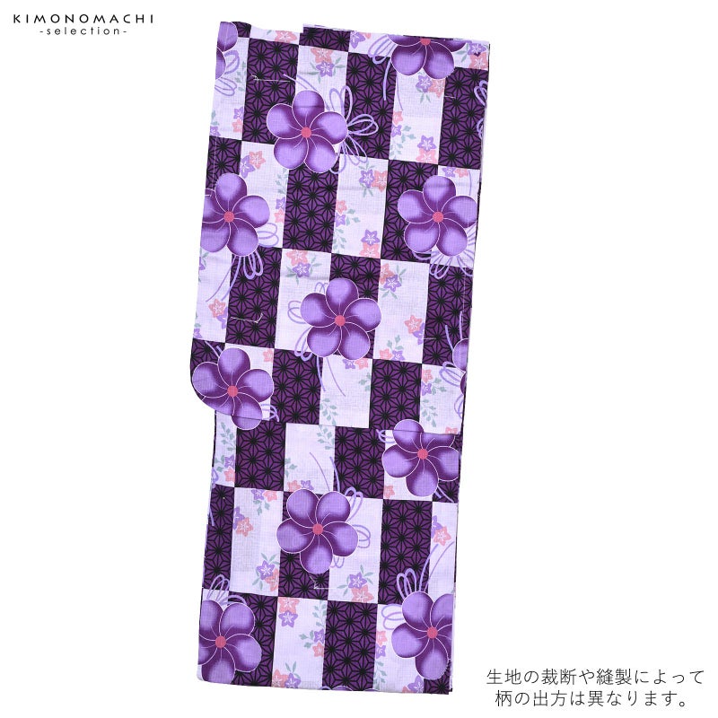 浴衣 レディース 単品 「プレタ浴衣 白×紫市松 紫の花」 フリーサイズ yukata 【メール便不可】
