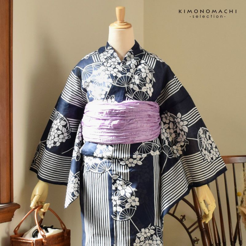 お祭り、花火大会、盆踊りに!涼し気な変わり織り浴衣単品 大人かわいいフリーサイズ 浴衣 レディース 単品 お仕立て上がり浴衣 プレタ「紺色 団扇」Fサイズ シック 大人 モダン 粋 ゆかた 女性 ブランド ブランド浴衣 花火大会 夏祭り 綿麻浴衣<H>【メール便不可】