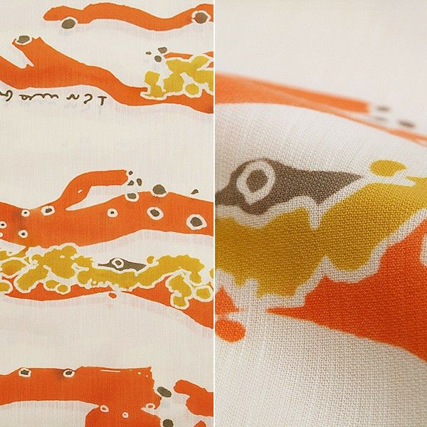 【カラー】柔らかな淡い生成り地に、オレンジ色、からし色のゆらぎの変わり横縞模様。どこか生き物のような、不思議なツモリらしい雰囲気。ところどころにtsumorichisatoのロゴも入っています。