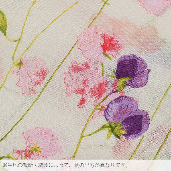 【カラー】薄い生成り地に、紫、ピンクの色使いの可愛らしいお花模様。
