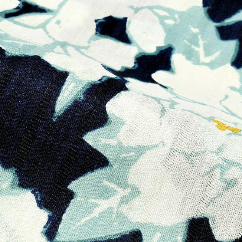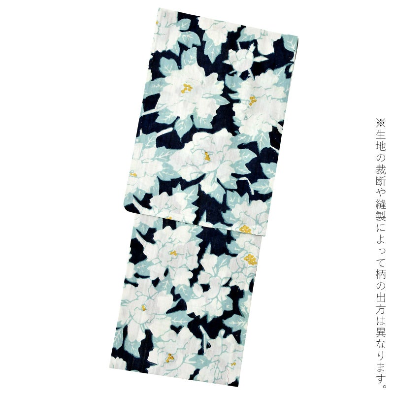 【カラー】深い紺色の地。浅い水色の輪郭線と葉で表現された、抽象的なお花の模様。くすんだ芥子色の蕊がポイント。手描き調のタッチと、ふんわりとやわらかな色合いが優しげな浴衣です。