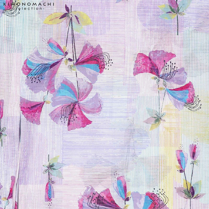 【色柄】淡いピンク、藤色、淡い青緑の細かな線で表現された乱調の格子と雲形の地。その上にグレーと鮮やかな赤紫、ターコイズブルー、淡い黄色で抽象的に表現されたつつじの花。黒の蕊がアクセントとなっています。