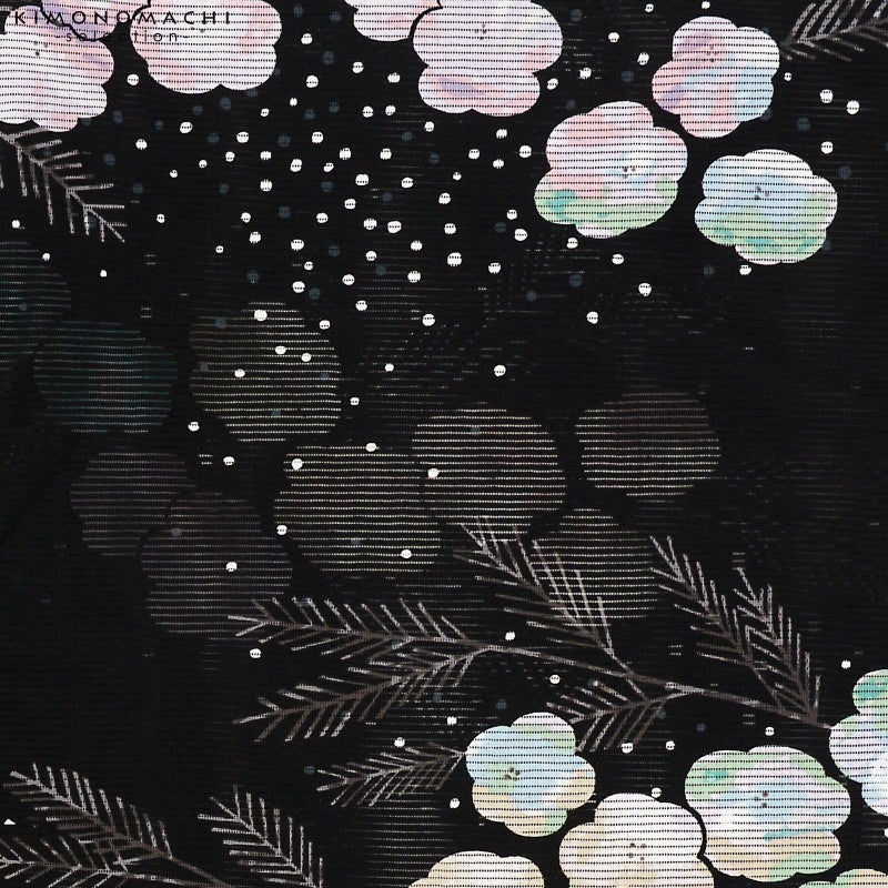 【色柄】黒地にぼたん雪のような丸みのあるお花。花の中は淡いピンクや薄紫色、ベージュや淡い青緑。チャコールの松葉。白やグレーのドットや三角がいろいろなところに降る雪のように散らされています。