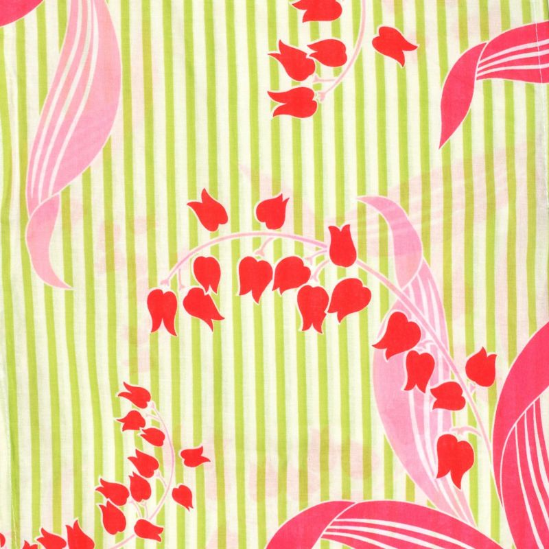 オフホワイトと明るい黄緑色のストライプの地に、抽象的なスズランの模様。ピンクや濃ピンクの葉、赤の花。