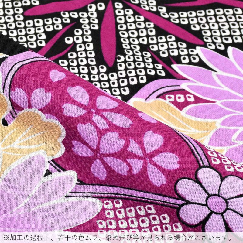黒地に白と藤色や赤紫を基調とした花紋。桜に菊や笹、鹿の子の模様。