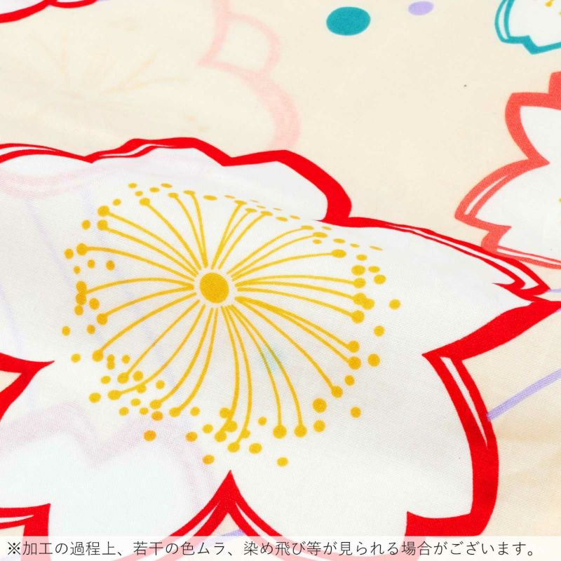【カラー】明るい薄クリーム色の地に、イラスト調の梅や桜の花紋。浅い藤色の曲線、ターコイズ系の水色、藤色、からし色のドット。深い紅色、サーモンピンク、水色の輪郭線に白の花。