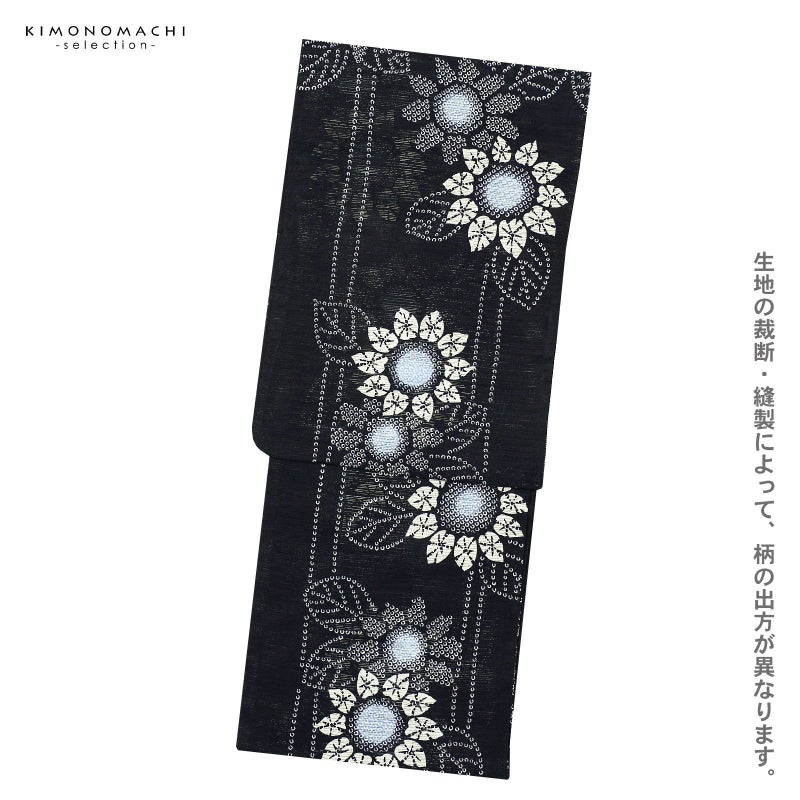 【色柄】濃紺の地に絞り風の鹿の子を連ねた縦縞、ヒマワリの花。お花の中心に浅い水色のぼかし。