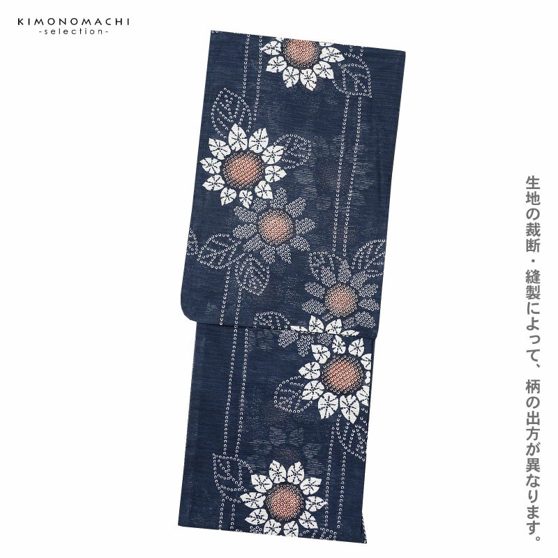 【色柄】浅い紺藍の地に絞り風の鹿の子を連ねた縦縞、ヒマワリの花。お花の中心に浅い洗朱色のぼかし。