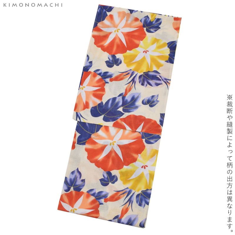 【カラー】生成り地に黄色と朱赤の大きな朝顔。葉は紺。