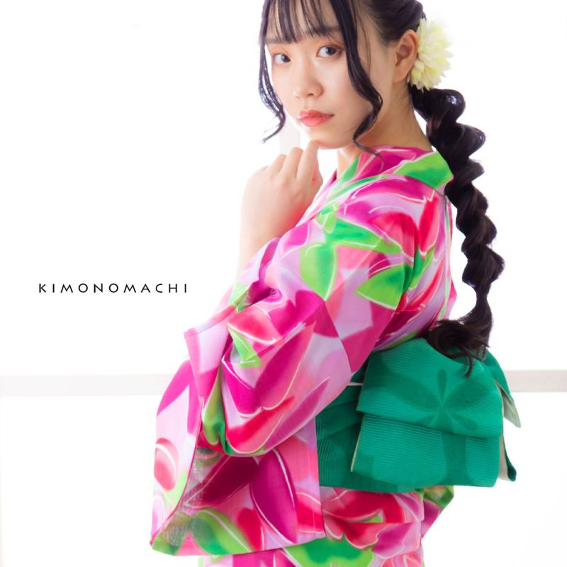 肌の色を明るく見せてくれる、キレイ色の浴衣。薄いピンク地に舞う、紫にマゼンタ、そして青葉を思わせる鮮やかな黄緑色の蝶々がデザインされていてキュート! ビビッドカラーの帯と相性バツグンです。