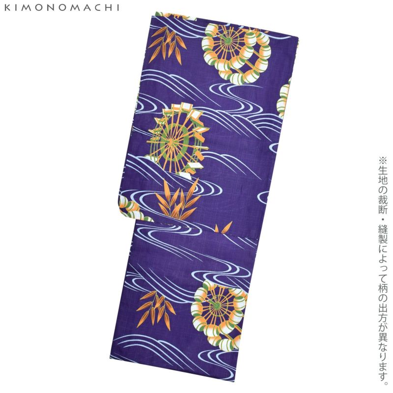 【カラー】青みのある紫色地に、水色の流水模様。水の流れの合間から、2種の水車と笹の葉が見えるのが涼しげ。水車の部分は白色と鶯色に明るいオレンジ色、ラインとところどころに黄土色。笹の葉は明るいオレンジ色に、影のように茶色がほんのりと。