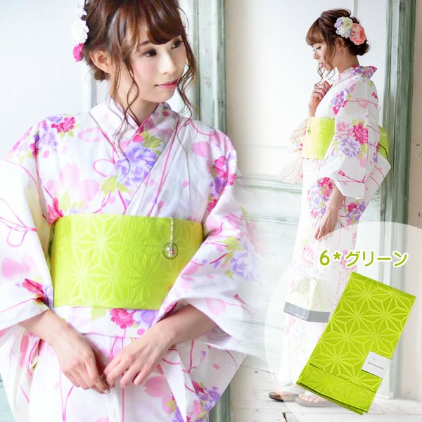 6:グリーン(緑 黄緑 レタスグリーン)…黄緑色の、鮮やかなレタスグリーンの帯です。暗色系の浴衣や、ピンク系の浴衣に合わせてもカワイイ色です。