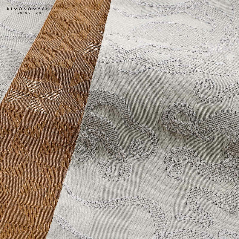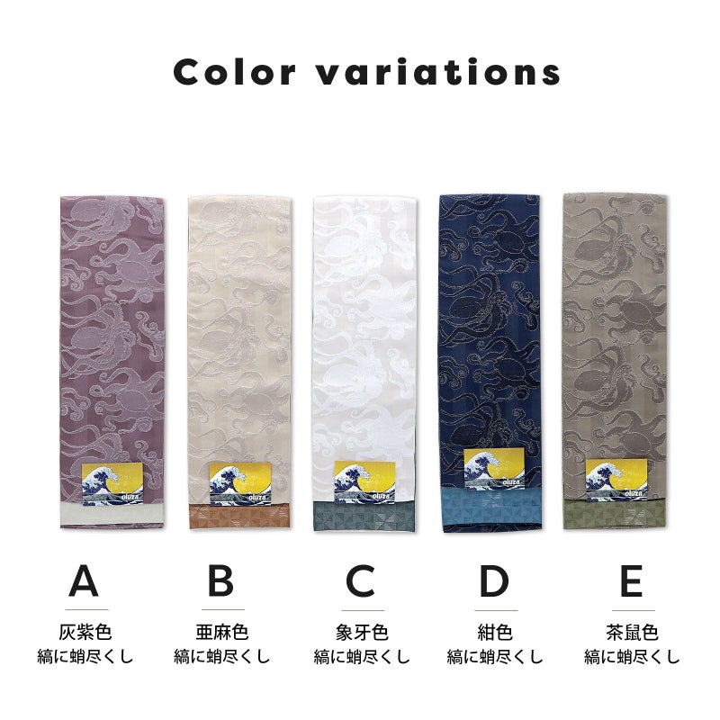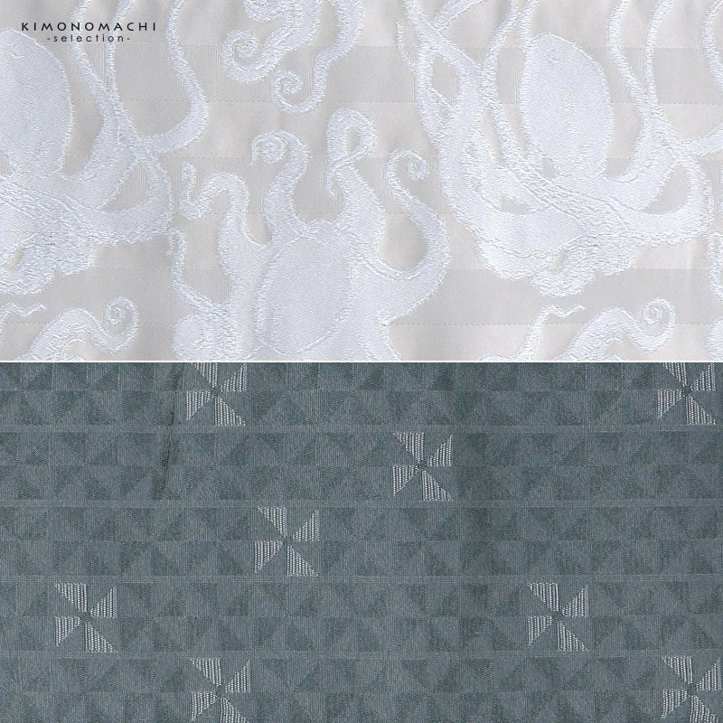 C.象牙色 縞に蛸尽くし:灰みのアイボリー。織りで表現された太縞の上に、白とシルバーでさまざまな形の蛸が表現されています。裏は浅い青鈍色の風車文様。