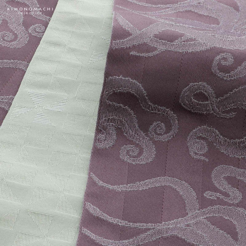 A.灰紫色 縞に蛸尽くし:灰みの鈍い赤紫色。織りで表現された太縞の上に、浅い藤鼠色とシルバーでさまざまな形の蛸が表現されています。裏は浅い白緑色の風車文様。