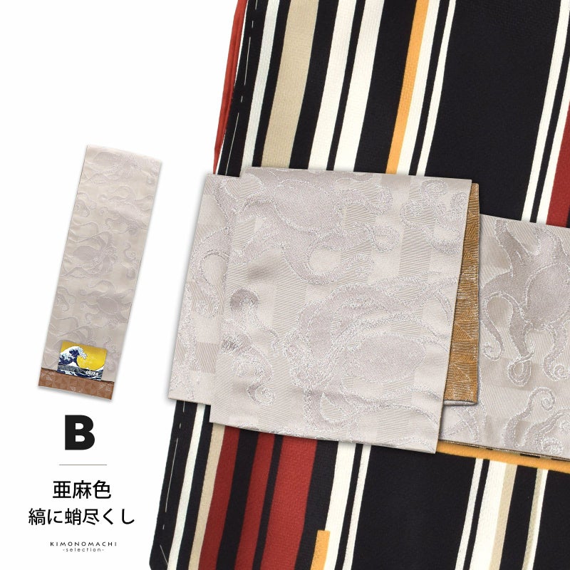 B.亜麻色 縞に蛸尽くし:灰みのベージュ。織りで表現された太縞の上に、ベージュとシルバーでさまざまな形の蛸が表現されています。裏は浅い茶色の風車文様。