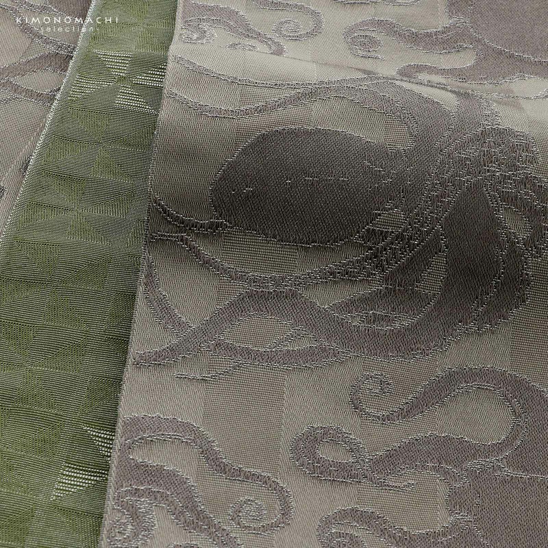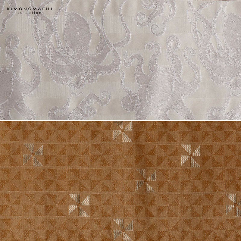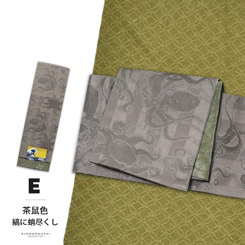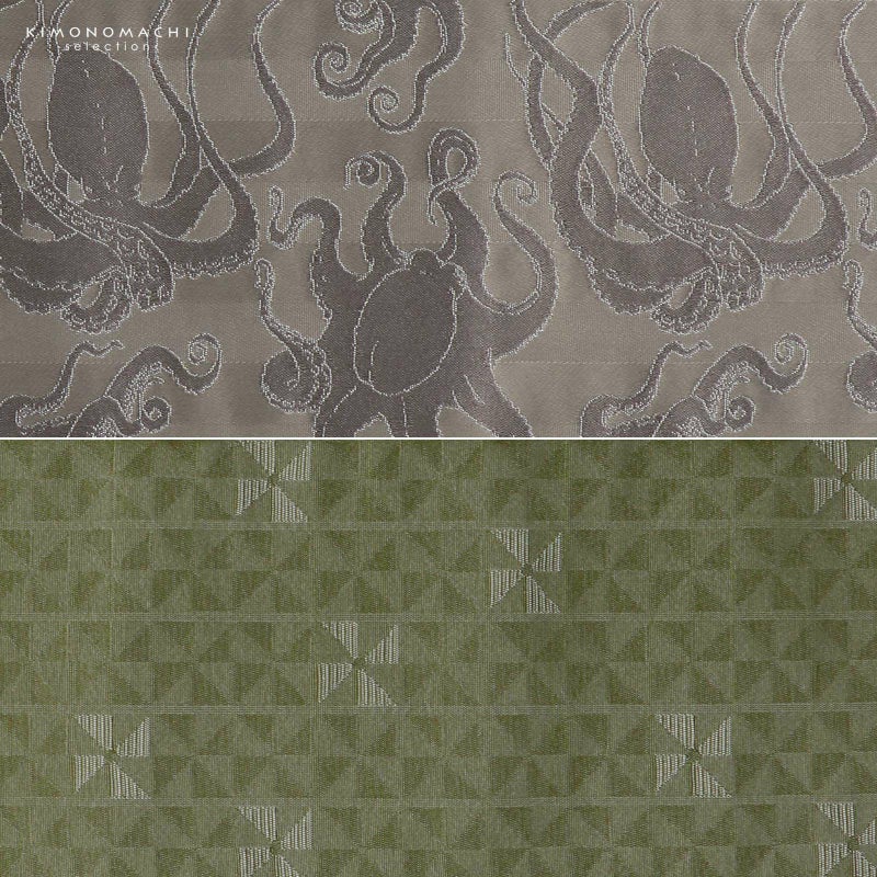 E.茶鼠色 縞に蛸尽くし:灰みの白茶色。織りで表現された太縞の上に、浅い茶とシルバーでさまざまな形の蛸が表現されています。裏は抹茶色の風車文様。