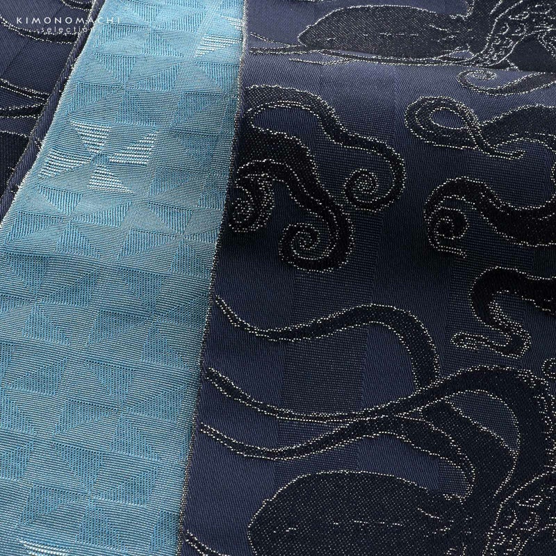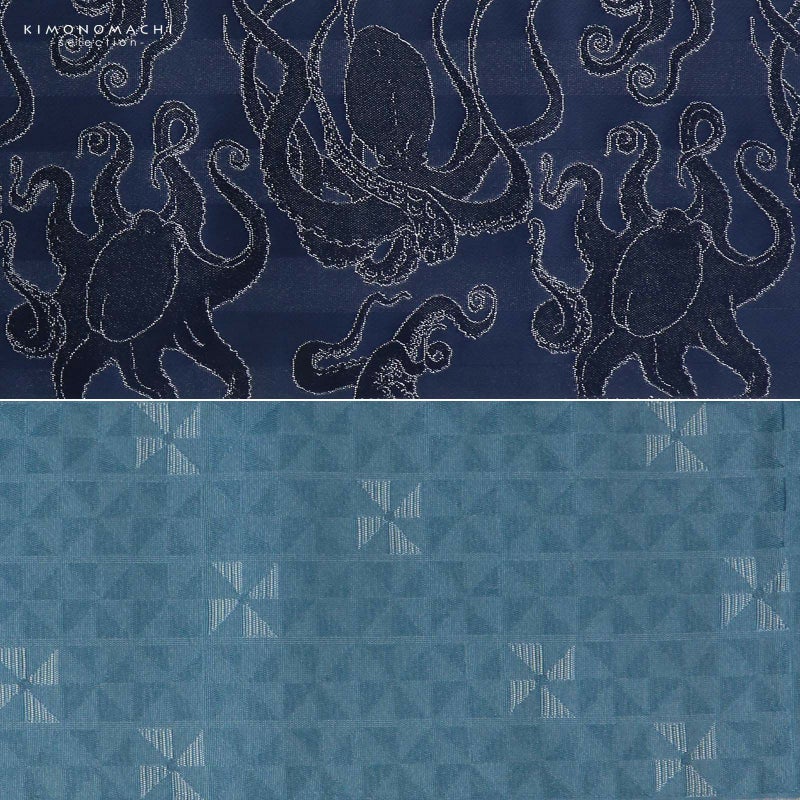 D.紺色 縞に蛸尽くし:紺色の地。織りで表現された太縞の上に、濃紺とシルバーでさまざまな形の蛸が表現されています。裏は浅い藍色の風車文様。
