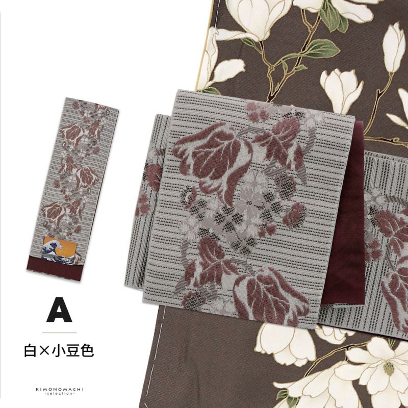 A.白×小豆色:グレイッシュな白に深いグレーの筋の入った地。白、グレー、小豆色でチューリップをメインとした花々が縦向きに織り出されています。裏は深い赤紫のヒヤシンス風のアラベスク文様。