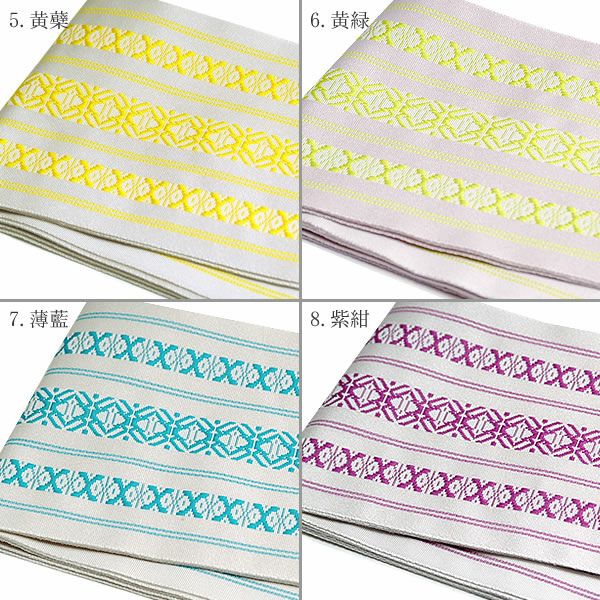 6.黄緑色(きみどり)・・・灰みの帯びた白色に、明るい爽やかな黄緑色の献上模様。