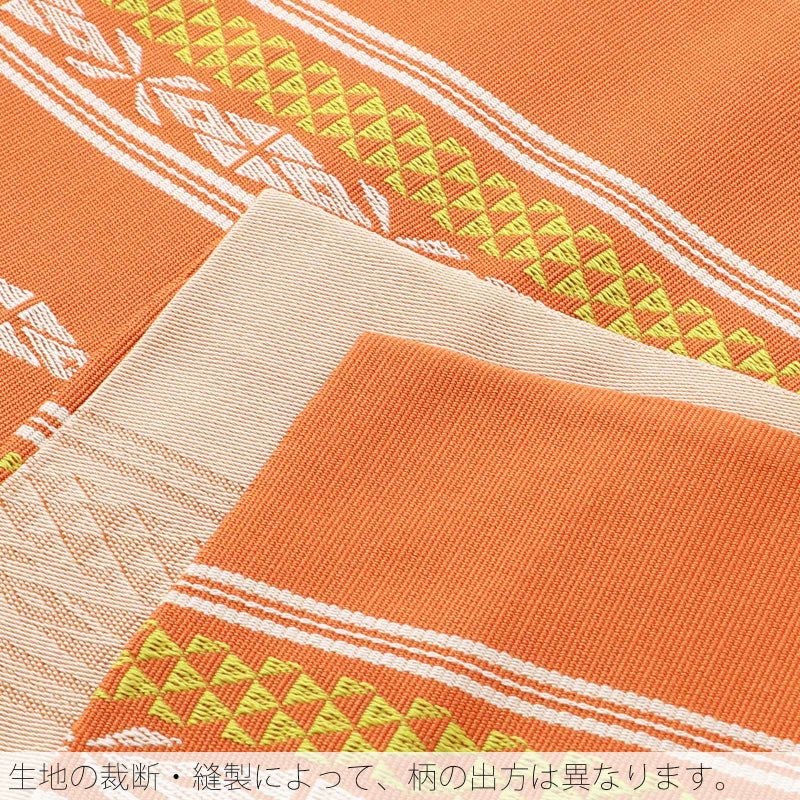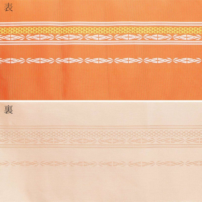 【カラー】やわらかい橙色系の珊瑚朱色の地に、献上柄風の縞模様。白のラインや幾何学模様、黄緑色の鱗模様。裏は淡い白。