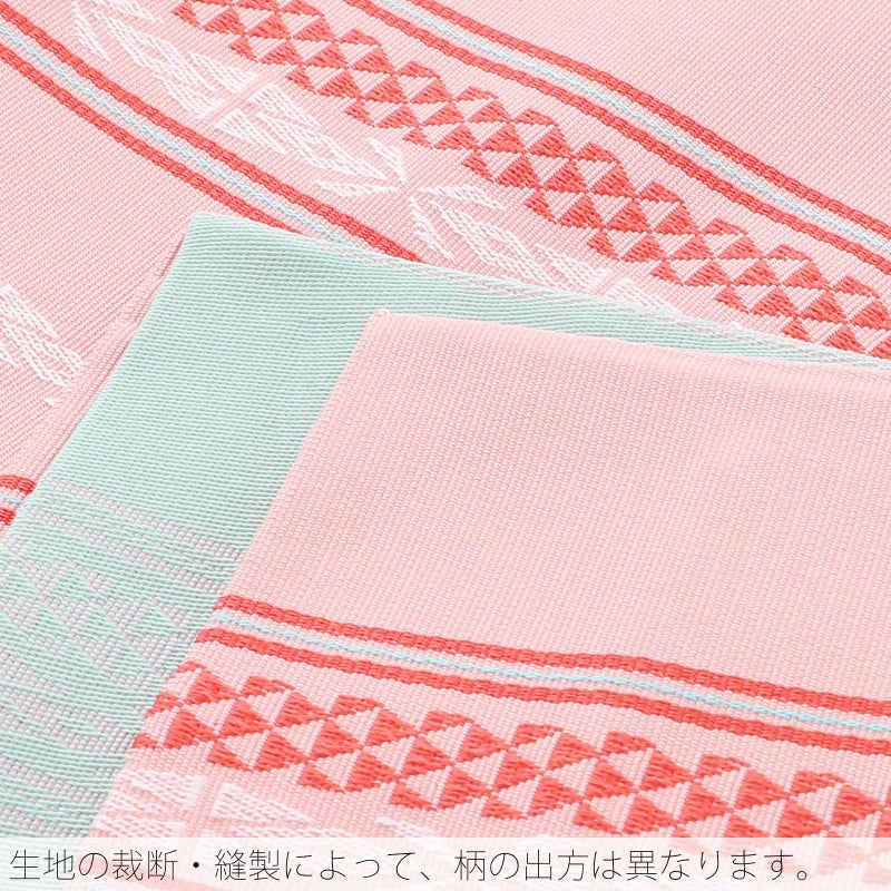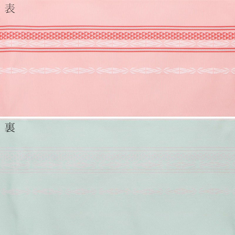 【カラー】淡いサーモンピンク色の地に、献上柄風の縞模様。白の幾何学模様、やわらかい朱色や鱗模様、水色の細い縞。裏は淡いグレイッシュな水色。