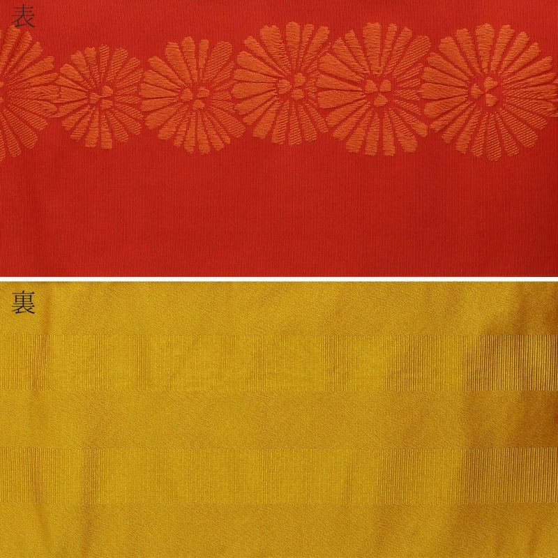 【カラー】明るい黄系の赤に、深いオレンジ色の花模様が並んだ帯。菊花のような唐松文様のような、シンプルながらどこか古典的な雰囲気のあるデザイン。裏は金茶色の地に織の二筋の縞。