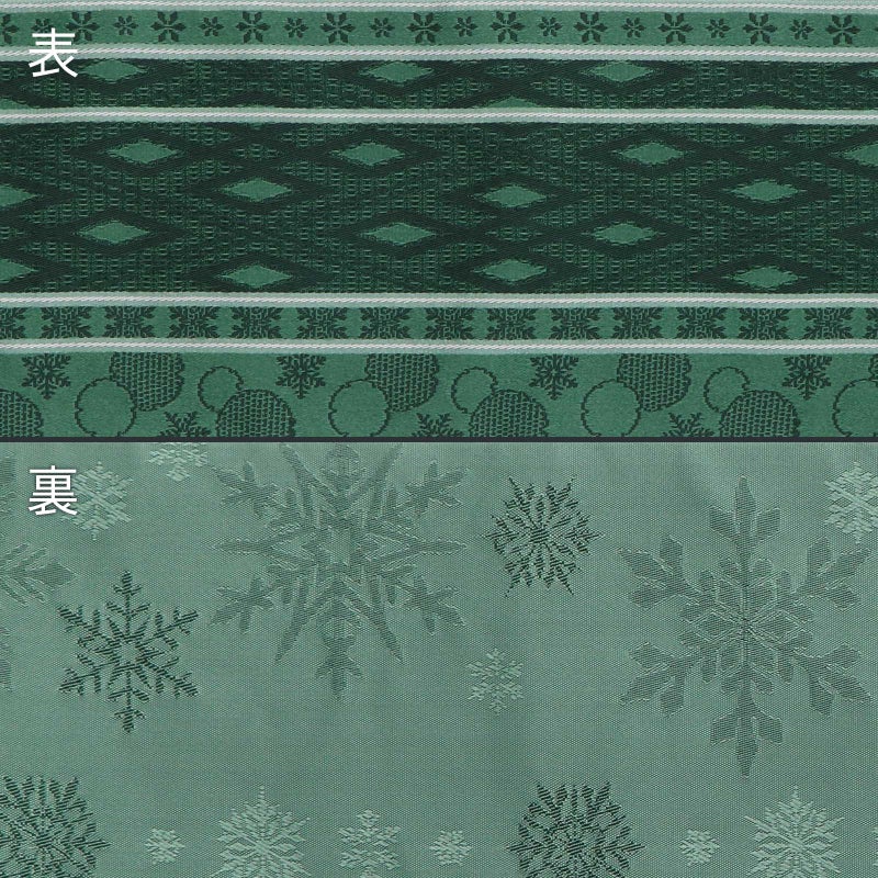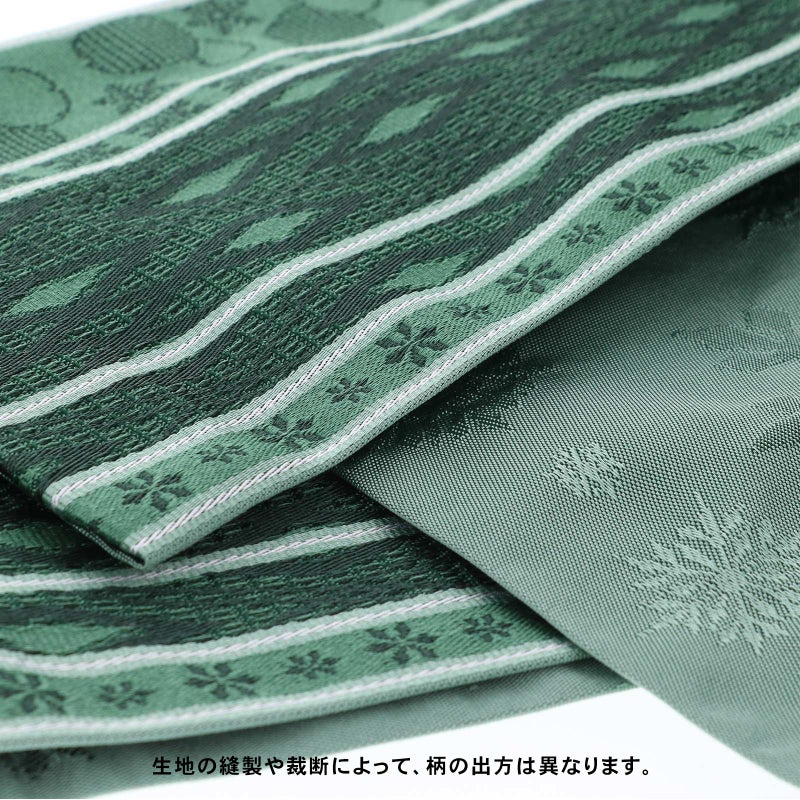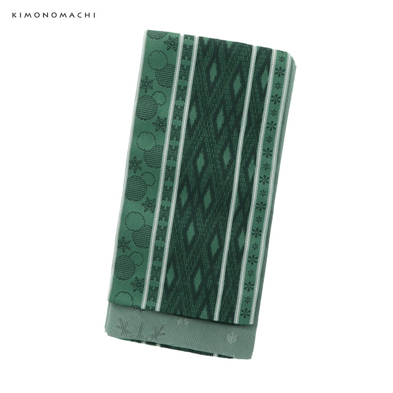 【色柄】ややグレイッシュな緑に深緑を合わせた配色。白の縦縞の中に菱格子文様、雪輪や雪花紋が配置された柄。裏は鈍い緑の地に大小さまざまな雪の結晶紋。