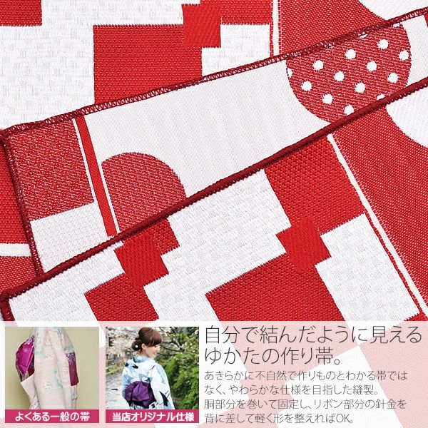 作り帯 京都きもの町オリジナル 浴衣帯 【Prices down】リボンタイプ 結び帯単品「赤色 幾何学」京都きもの町オリジナル 浴衣帯 作り帯 付け帯 【メール便不可】
