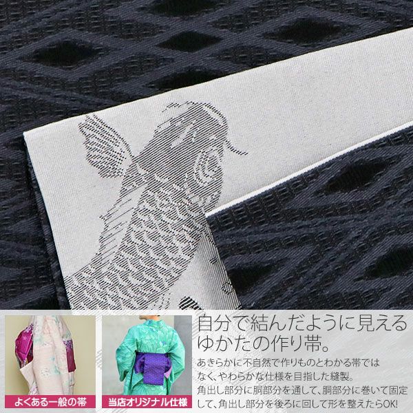 作り帯 京都きもの町オリジナル 浴衣帯 角出し風タイプ 結び帯単品「黒色 菱格子」京都きもの町オリジナル 浴衣帯 作り帯 付け帯 【メール便不可】